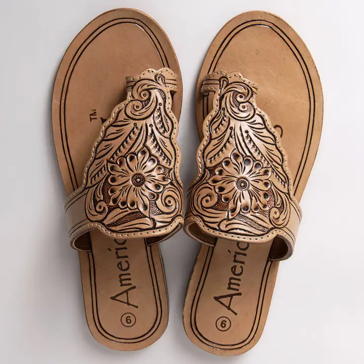 This exquisite sandal is hand crafted with the finest American Cowhide Leather, boasting intricate hand tooling and a stunning antique finish. The flat moulded sole offers both comfort and style. Designed by American Darling in Texas, this western-inspired collection combines heritage with fashion-forward design. Made with eco-friendly materials for a truly luxurious and eye-catching footwear experience.