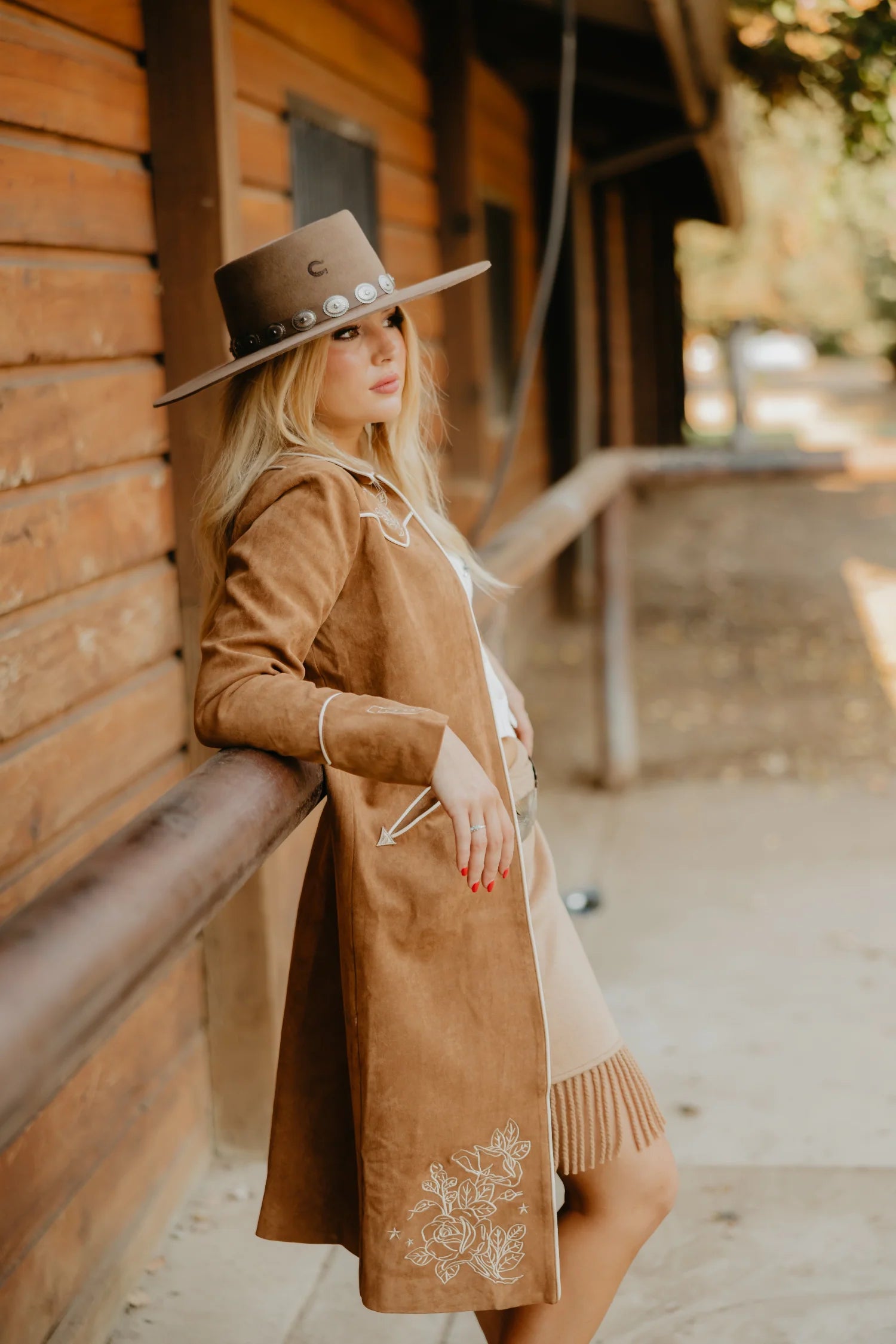 The Hall of Fame Duster blends vintage Western style with modern craftsmanship. Crafted from a durable 95% polyester and 5% spandex blend with a 100% polyester lining, this long brown coat offers comfort and flexibility. Its distinctive smile pockets and detailed embroidery pay homage to classic Western tailoring, making it an elegant yet functional piece for cowgirls destined to make a statement.